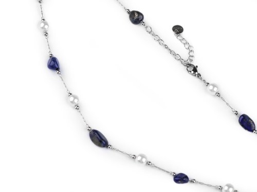 Jemný řetízkový náhrdelník z kvalitní nerezové oceli je ozdobený barevnými korálky syntetických minerálů a perlami. Korálky mají působivé průsvity, jedná se o zdařilou kopii pravých minerálů. Náhrdelník se hodí k slavnostním šatům i na běžné nošení, má velice všestranné využití. Zapíná se na karabinku a prodlužovací řetízek. Upozorňujeme zákazníky, že barvy i tvar korálků se může lišit.