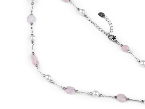 Jemný řetízkový náhrdelník z kvalitní nerezové oceli je ozdobený barevnými korálky syntetických minerálů a perlami. Korálky mají působivé průsvity, jedná se o zdařilou kopii pravých minerálů. Náhrdelník se hodí k slavnostním šatům i na běžné nošení, má velice všestranné využití. Zapíná se na karabinku a prodlužovací řetízek. Upozorňujeme zákazníky, že barvy i tvar korálků se může lišit.