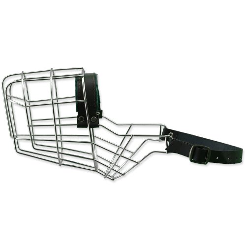 Kovový náhubek s koženými řemínky na zapínání pro fenu dobrmana.