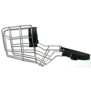 Kovový náhubek s koženými řemínky na zapínání pro dobrmana.