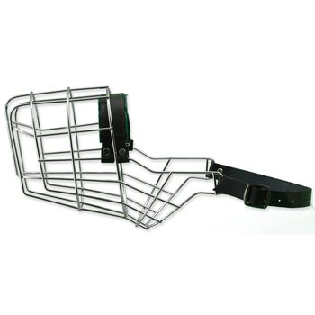 Kovový náhubek s koženými řemínky na zapínání.