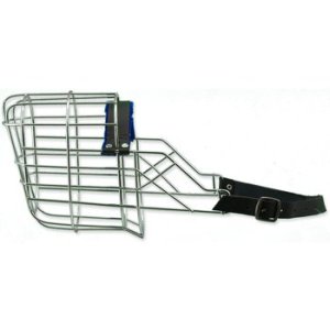 Kovový náhubek s koženými řemínky na zapínání pro německého ovčáka.