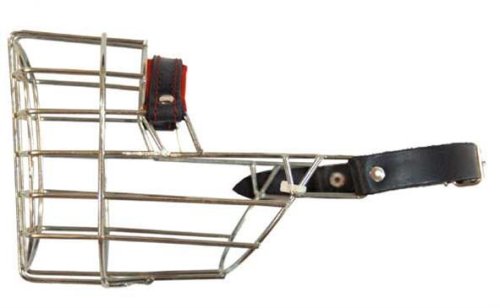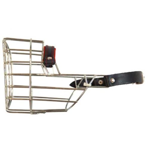 Kovový náhubek s koženými řemínky na zapínání. Vhodný zejména pro feny kokršpanělů a podobná plemena. Rozměry: 100 x 70 x 120 mm (šířka x hloubka x výška)
