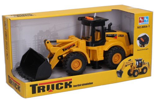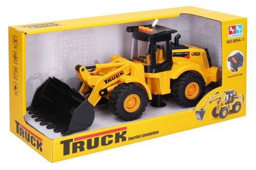 Nakladač na setrvačník s efekty. Rozměry 35x11x13 cm. S pohyblivou radlicí. Na setrvačník. Vydává světelné a zvukové efekty. Aktivace tlačítky na střeše. 3xAG13 baterie, součástí balení.