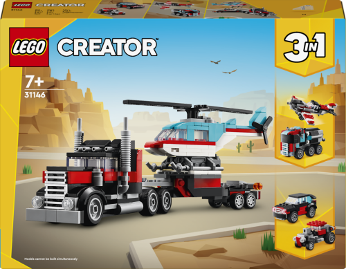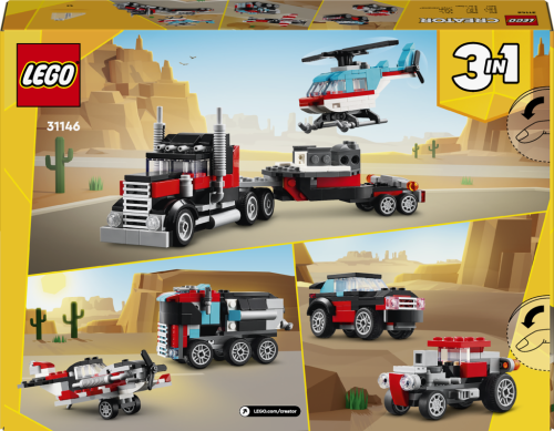 Děti od 7 let se se stavebnicí LEGO® Creator 3 v 1 (31146) Náklaďák s plochou korbou a helikoptéra pustí do akčního hraní. Sada se skládá z 270 dílků, ze kterých si malí stavitelé postaví parádní náklaďák s otáčecími koly a korbou, na které přistane helikoptéra LEGO s pohyblivou vrtulí.