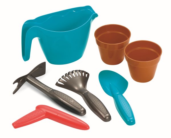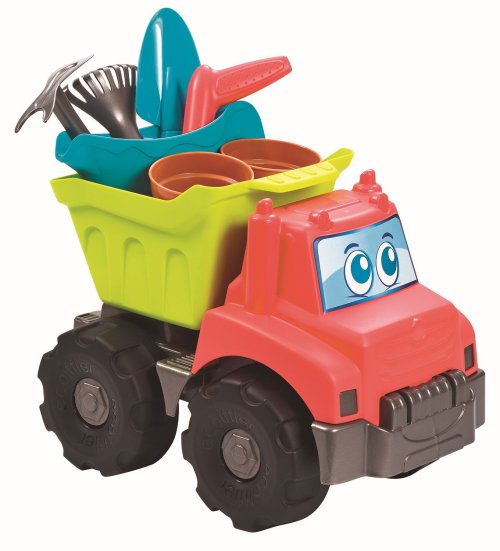 Sklápěč s legračními očima na zahradu nebo na písek. Součástí konvička, dva květináče, lopata, hrábě, rýč a sázecí kolík. Rozměry (DxŠxV): 32,5 x 20 x 25 cm.