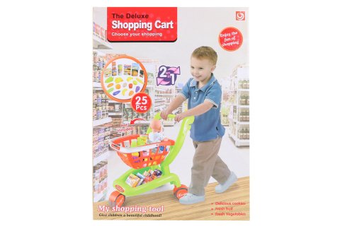 Plastový nákupní košík/vozík na kolečkách. Rozměr samotného košíku cca 36 x 16, Rozměr složeného vozíku na kolečkách cca 45 x 53 cm. Balení dále obsahuje 25 ks potravin. Rozměry balení cca 33 x 45 x 21,5 cm. Věk 3+
