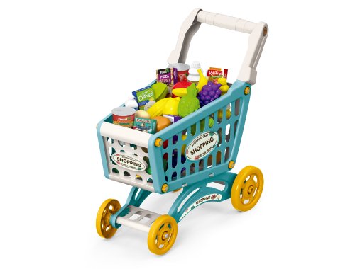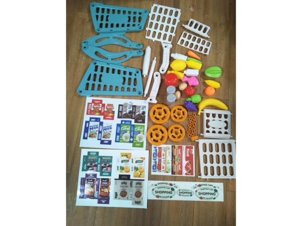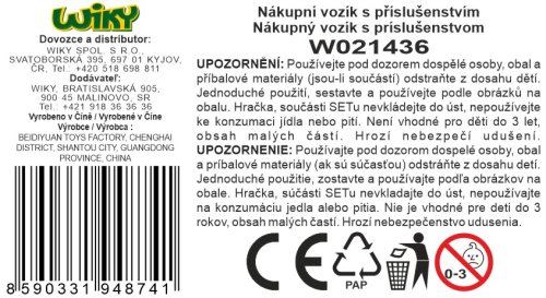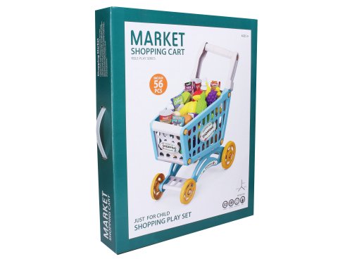 Nákupní vozík s potravinami. Rozměry vozíku 40 x 24,5 x 44 cm. Obrázkový návod na složení se nachází na obalu. Balení obsahuje 56 kusů potravin.