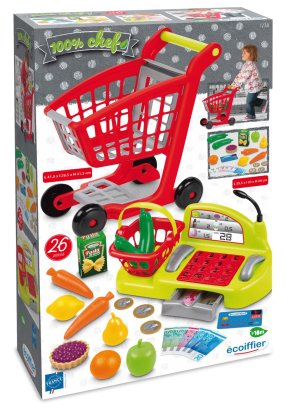 Nákupní vozík s ovocem, zeleninou, potravinami. Součástí je i pokladna s penězi, platební kartou, skenerem a mikrofonem. Nechybí ani malý nákupní košík do ruky. Rozměry (DxŠxV) pokladna: 41,5 x 29,5 x 41,5 cm a vozík: 35,5 x 23 x 20 cm.