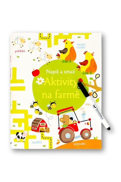 Zvířátka z farmy čekají na to, až jim pomůžeš vyřešit úkoly. Hledej rozdíly mezi slepicemi, proveď bludištěm kačenku, dokresli listy leknínu a spočítej včely letící do úlu. Při plnění úloh používej stíratelný fix, a tak se můžeš k úlohám vracet znovu a znovu. Děti si s touto knihou aktivit procvičí soustředění, postřeh, psaní rovných a klikatých čar a počítání. Fix je součástí balení.