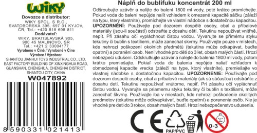 Náplň do bublifuku koncentrát. Objem balení 200 ml. Rozměry obalu 22,8x30 cm.