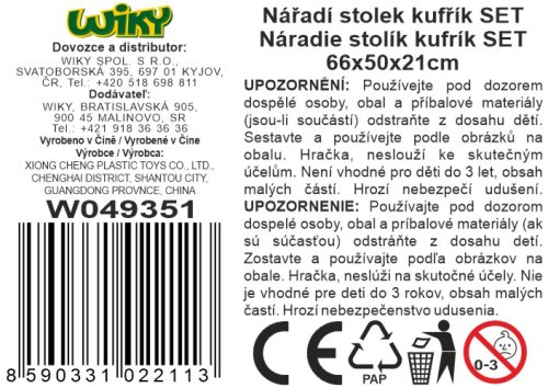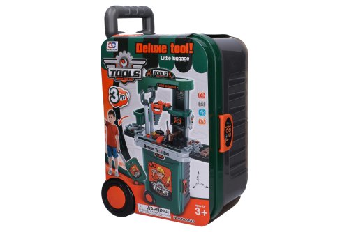Nářadí stolek kufřík set. Velikost 38 cm. Kufřík je na kolečkách a má vysunovací madlo. Výška s vysunutým madlem 55,5 cm, výška se zasunutým madlem 38 cm. Kufřík jde přestavět na kutilský stolek o rozměrech: 66x50x21cm. Návod na sestavení na obalu. Obsah balení stolek, šroubky, ozubená kola, svěrák a další příslušenství.