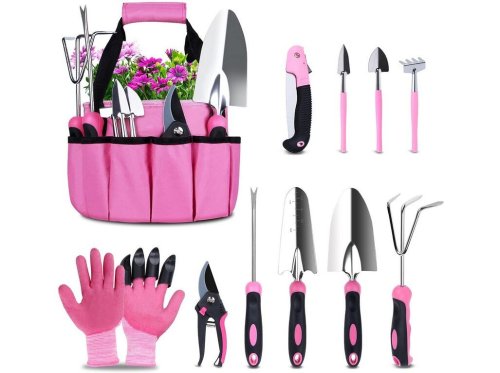 sada ručního zahradního nářadí, vše v růžovém a růžovo-černém provedení