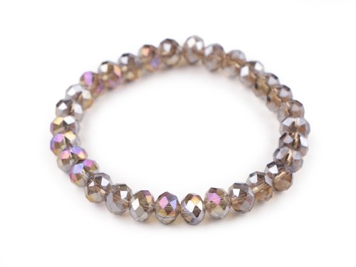 Náramek z broušených skleněných korálků s AB efektem je velice elegantní a efektní. Precizní brus na korálcích způsobuje působivý třpyt a lesk. Díky pružence má náramek univerzální velikost, snadno se natáhne na ruku. Vkusně ozdobí zápěstí na společenských událostech, ale také si ho můžete vzít do práce k halence nebo kostýmku. Zkuste kombinovat více kusů a barev dohromady, výsledek bude efektnější. Černý náramek č. 5 je bez AB úpravy.
