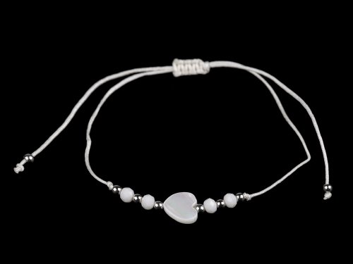 Náramky s perleťovým srdíčkem jsou dokonalým doplňkem letního outfitu. Hodí se jak k šatům, tak k halenkám, tričkům i plavkám. Prodávají se jako sada 12 ks na papírové kartě k zavěšení, každý náramek má jinou barvu. Na šňůrky je doprostřed navlečené srdíčko velké 1 cm, broušené a kovové korálky. Zapínání je posuvné, oba konce náramku procházejí středovým uzlem, který umožňuje utažení šňůrek. Náramek má univerzální velikost.