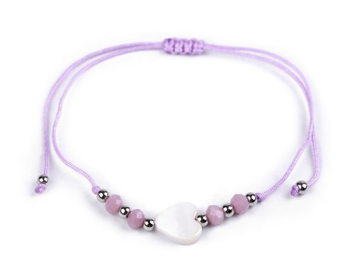 Náramky s perleťovým srdíčkem jsou dokonalým doplňkem letního outfitu. Hodí se jak k šatům, tak k halenkám, tričkům i plavkám. Prodávají se jako sada 12 ks na papírové kartě k zavěšení, každý náramek má jinou barvu. Na šňůrky je doprostřed navlečené srdíčko velké 1 cm, broušené a kovové korálky. Zapínání je posuvné, oba konce náramku procházejí středovým uzlem, který umožňuje utažení šňůrek. Náramek má univerzální velikost.
