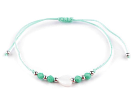 Náramky s perleťovým srdíčkem jsou dokonalým doplňkem letního outfitu. Hodí se jak k šatům, tak k halenkám, tričkům i plavkám. Prodávají se jako sada 12 ks na papírové kartě k zavěšení, každý náramek má jinou barvu. Na šňůrky je doprostřed navlečené srdíčko velké 1 cm, broušené a kovové korálky. Zapínání je posuvné, oba konce náramku procházejí středovým uzlem, který umožňuje utažení šňůrek. Náramek má univerzální velikost.