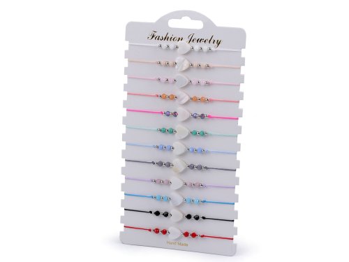 Náramky s perleťovým srdíčkem jsou dokonalým doplňkem letního outfitu. Hodí se jak k šatům, tak k halenkám, tričkům i plavkám. Prodávají se jako sada 12 ks na papírové kartě k zavěšení, každý náramek má jinou barvu. Na šňůrky je doprostřed navlečené srdíčko velké 1 cm, broušené a kovové korálky. Zapínání je posuvné, oba konce náramku procházejí středovým uzlem, který umožňuje utažení šňůrek. Náramek má univerzální velikost.