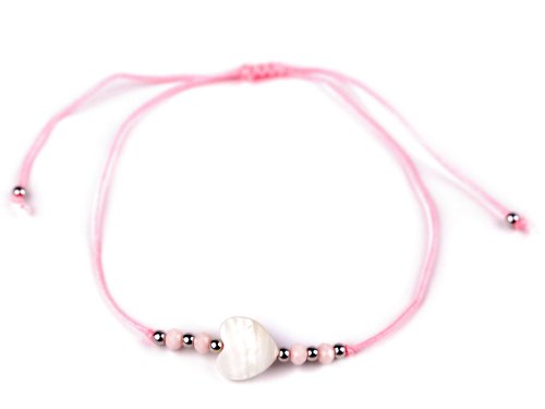Náramky s perleťovým srdíčkem jsou dokonalým doplňkem letního outfitu. Hodí se jak k šatům, tak k halenkám, tričkům i plavkám. Prodávají se jako sada 12 ks na papírové kartě k zavěšení, každý náramek má jinou barvu. Na šňůrky je doprostřed navlečené srdíčko velké 1 cm, broušené a kovové korálky. Zapínání je posuvné, oba konce náramku procházejí středovým uzlem, který umožňuje utažení šňůrek. Náramek má univerzální velikost.