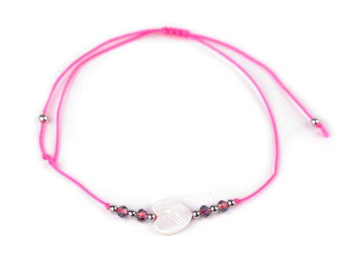 Náramky s perleťovým srdíčkem jsou dokonalým doplňkem letního outfitu. Hodí se jak k šatům, tak k halenkám, tričkům i plavkám. Prodávají se jako sada 12 ks na papírové kartě k zavěšení, každý náramek má jinou barvu. Na šňůrky je doprostřed navlečené srdíčko velké 1 cm, broušené a kovové korálky. Zapínání je posuvné, oba konce náramku procházejí středovým uzlem, který umožňuje utažení šňůrek. Náramek má univerzální velikost.