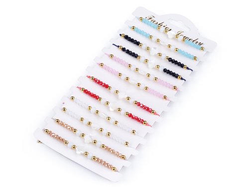 Shamballa náramky s korálkem z přírodní perleti jsou úžasným doplňkem letního outfitu. Hodí se jak k šatům, tak k halenkám, tričkům i plavkám. Perleť doplňují skleněné broušené a kovové korálky. Některé náramky mají AB efekt, jenž způsobuje zajímavé světelné odlesky. Zapínání je posuvné, oba konce náramku procházejí středovým uzlem, který umožňuje utažení šňůrek. Náramek má univerzální velikost. [Náramky v mixu se prodávají jako sada 12 ks] na papírové kartě k zavěšení.