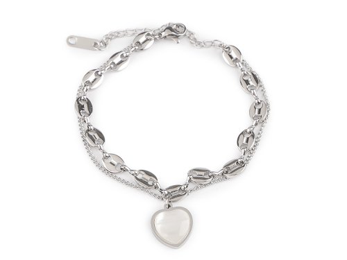 Dvojitý náramek s přívěskem srdce má kvalitní zpracování z nerezové oceli. Srdce je ozdobené poutavou imitací perleti. Náramek má provedení ve vysokém lesku, dá se nosit jako doplněk k jakémukoliv oděvu. Potěší srdce každé ženy, bude perfektním dárkem na Valentýna. Zapíná se na karabinku a prodlužovací řetízek.