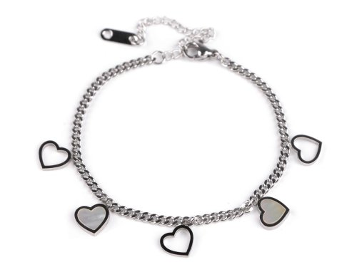 Řetízkový náramek z nerezové oceli je ozdobený motivem srdce. Náramek má kvalitní zpracování, romanticky dozdobí vaše zápěstí. Bude krásným a stylovým dárkem nejen na Valentýna. Zapíná se na karabinku a prodlužovací řetízek. Řetízek č.1 je z plochých oček, je ozdobený řadou přívěsků srdcí s vysokým zrcadlovým leskem. 2 srdíčka jsou ozdobená imitací perleti. Řetízek č.2 je z propojených článků, které vypadají jako malé větvičky. Je ozdobený srdcem s imitací perleti.