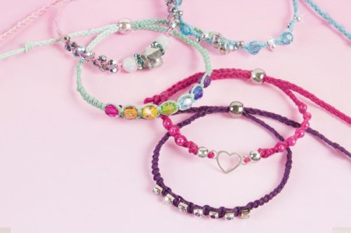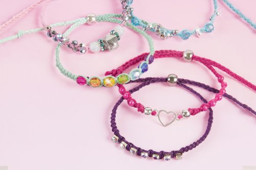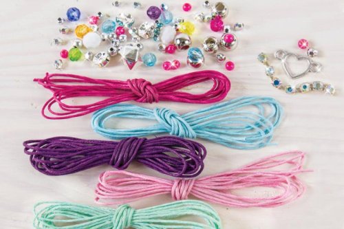 Výroba náramků z bavlnek a korálků. Korálky se vkládají nebo navlékají na bavlnky, které jsou součástí balení. Obsahuje mnoho barevných a blýskavých korálků. Baleno v krabici. Doporučený věk 8+