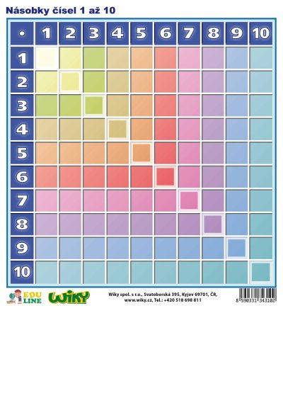 Oboustranná didaktická pomůcka s vyobrazením násobků čísel od 1 do 10 je určena především pro 3. a 4. ročník základní školy.