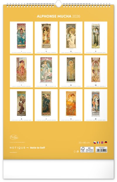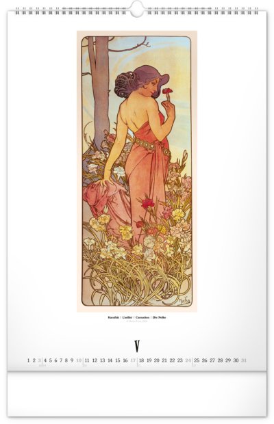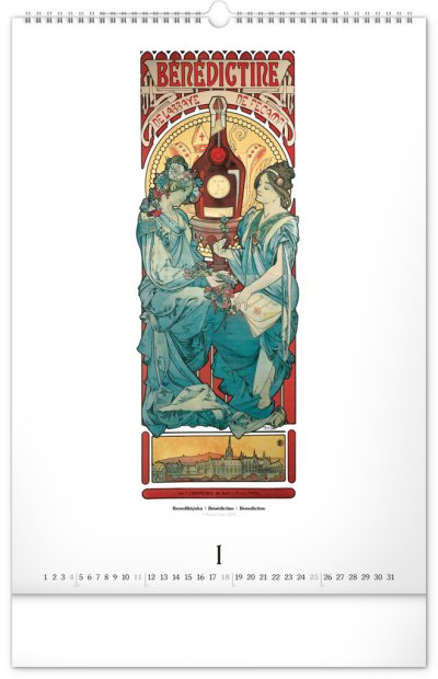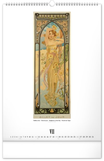 Nástěnný kalendář ve velkém formátu s reprodukcemi obrazů oblíbeného secesního malíře českého původu. Reprodukce doplňuje vkusné univerzální kalendárium s vyznačenými nedělemi a popisky děl ve čtyřech jazycích (CZ, FR, EN, DE).