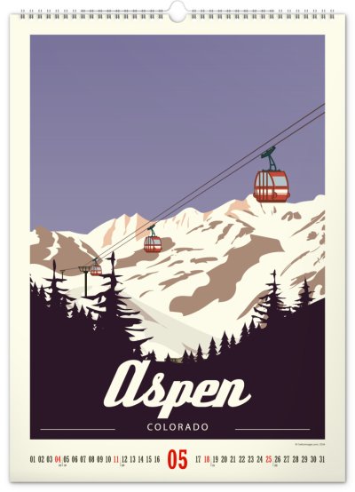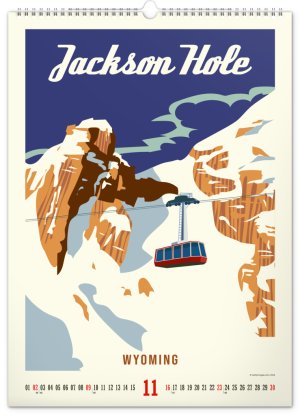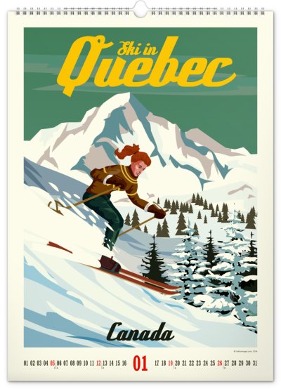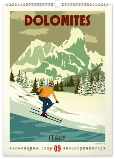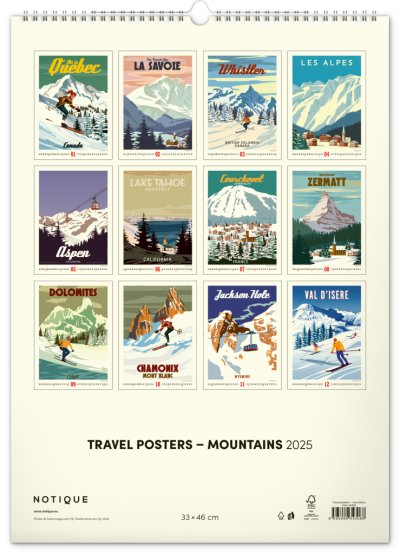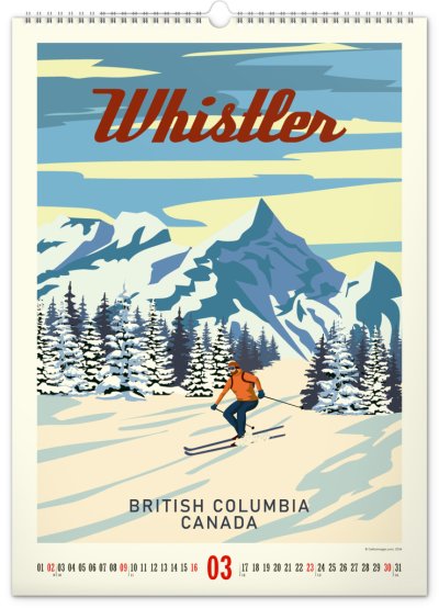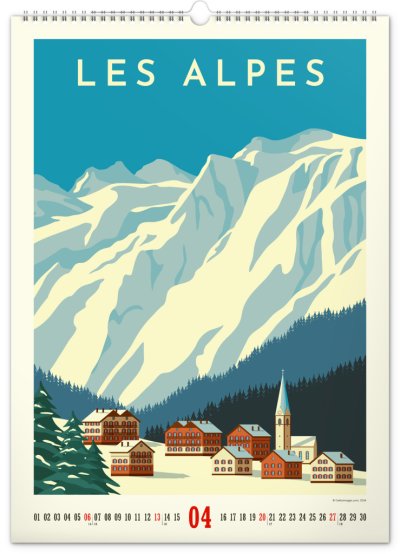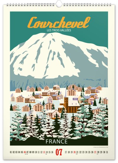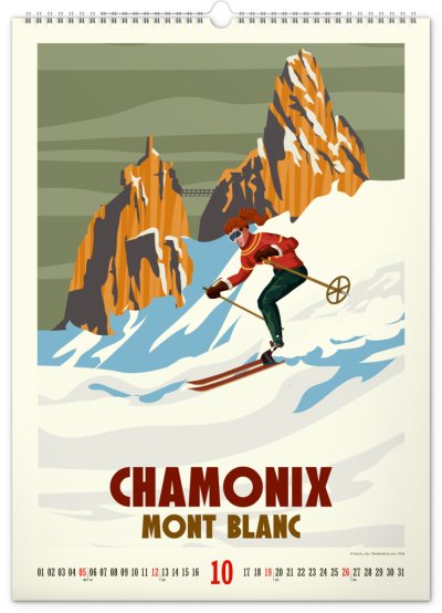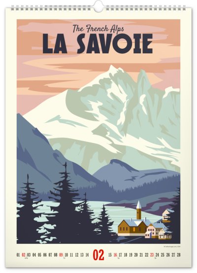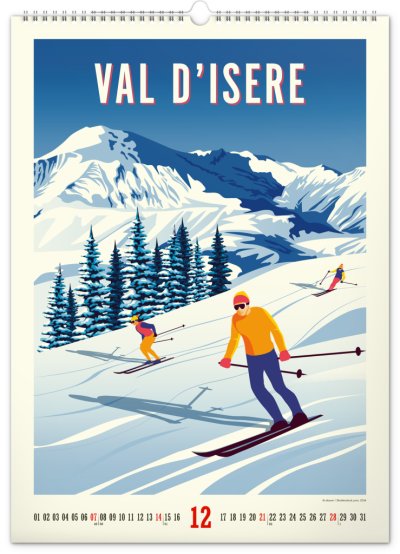 Velkoformátový kalendář s pečlivě vybranými klasickými plakáty horských středisek.