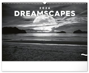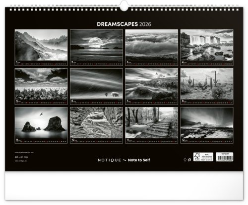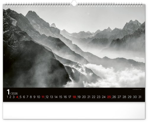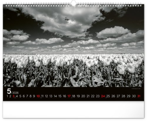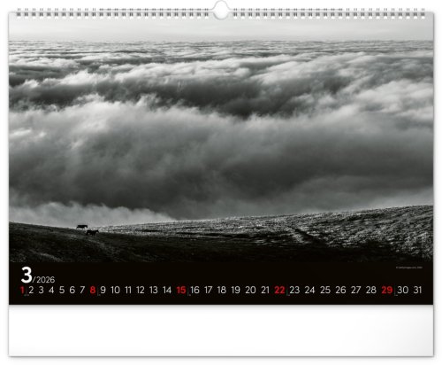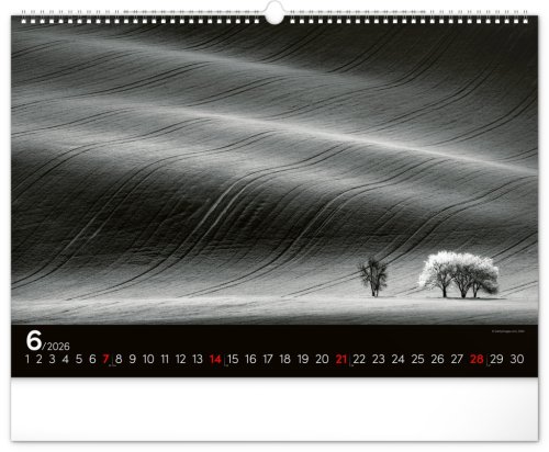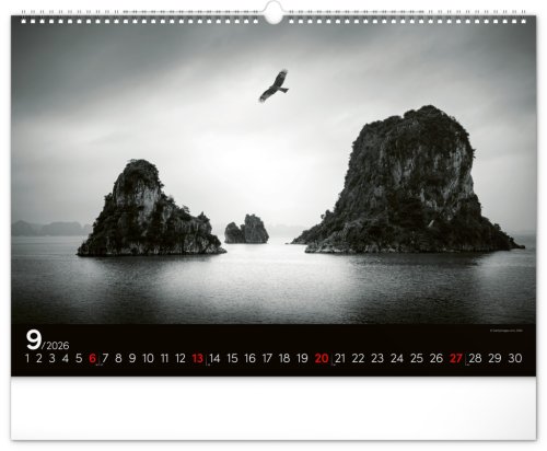 Zasněte se při pohledu na dvanáct úchvatných snímků krajiny v černobílém hávu. Jednoduché kalendárium na černém pozadí.