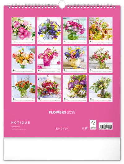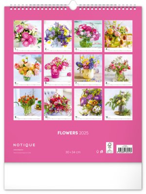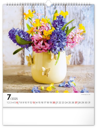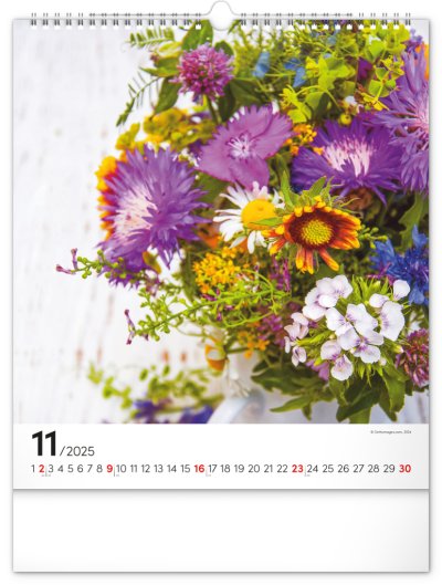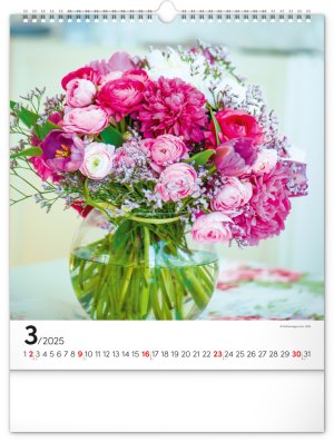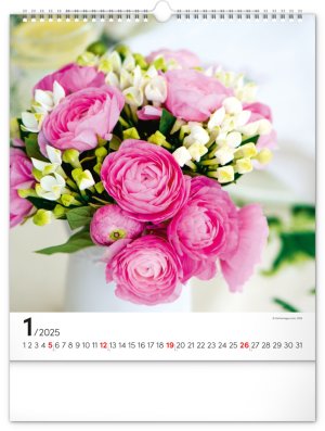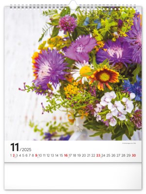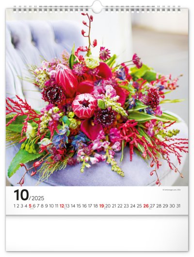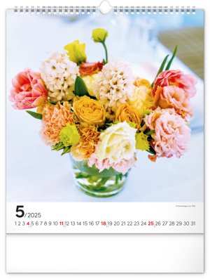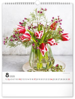 Fotografie pestrobarevných květin a originálních vazeb v nástěnném kalendáři na výšku. Fotografie doplňuje univerzální kalendárium na bílém pozadí.