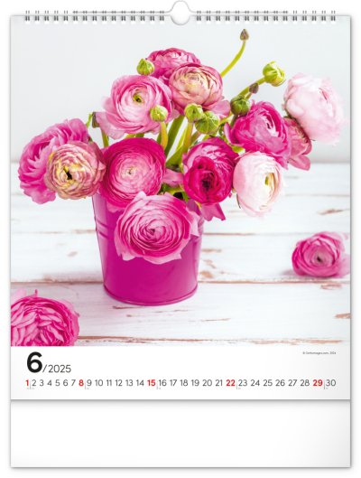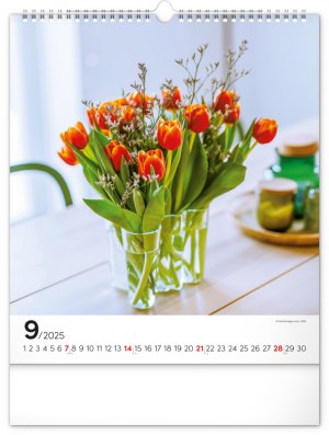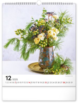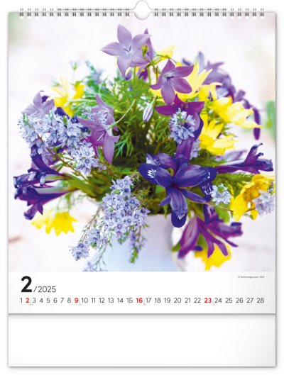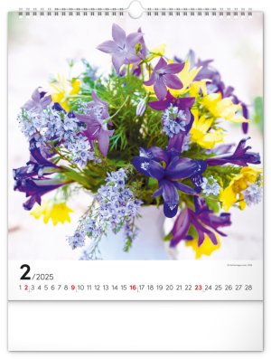 Fotografie pestrobarevných květin a originálních vazeb v nástěnném kalendáři na výšku.