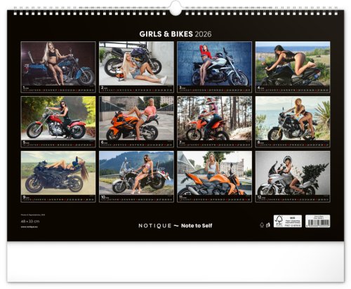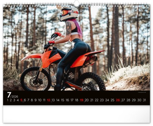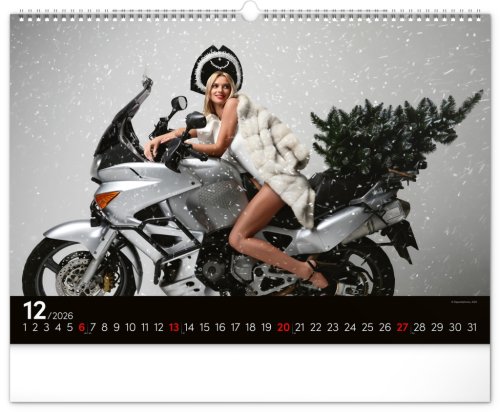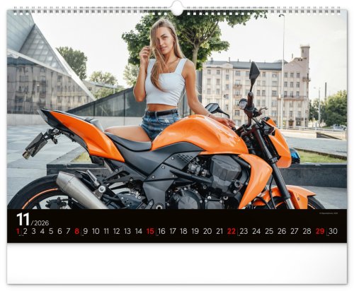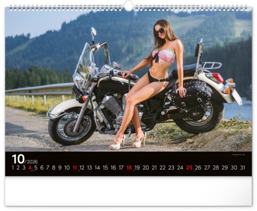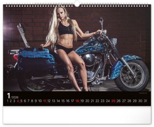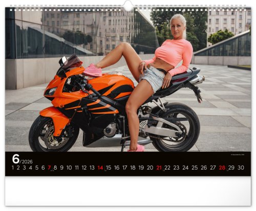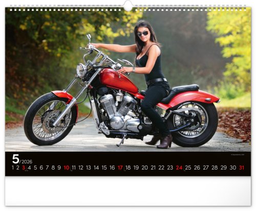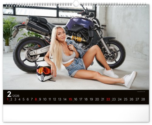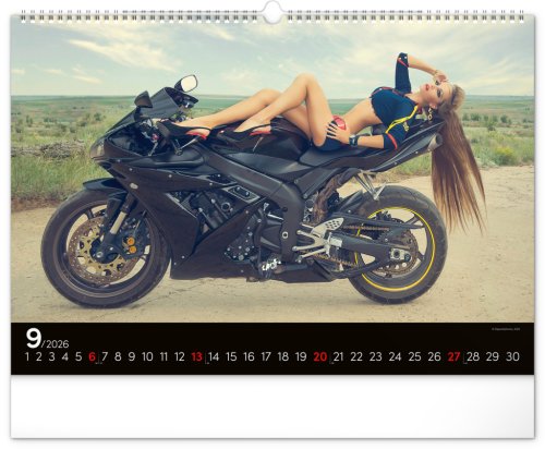 Kalendář pro milovníky žen a silných strojů. Na stránkách nástěnného kalendáře v šířkovém formátu pózuje dvanáct krásných žen s nablýskanými motocykly . Obsahuje univerzální kalendárium.