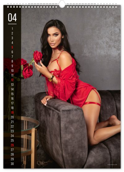 Exkluzivní akty krásných mladých žen. Kalendář obsahuje jednoduché kalendárium se zvýrazněnými nedělemi na černém pozadí.