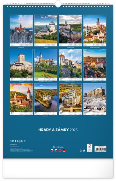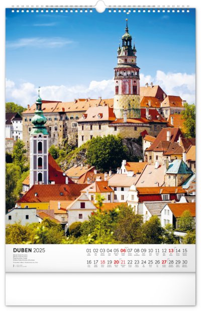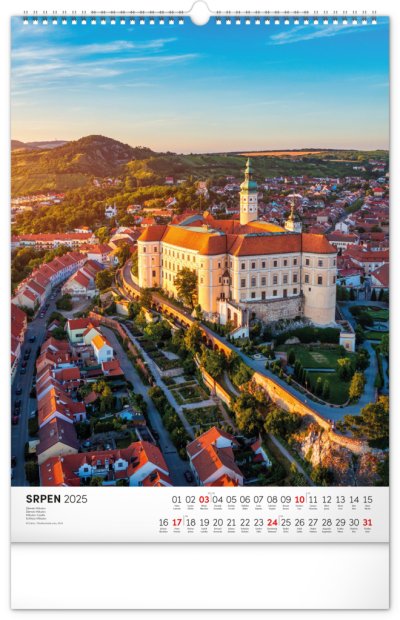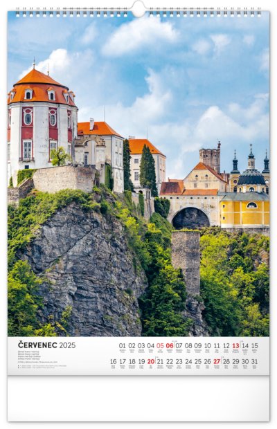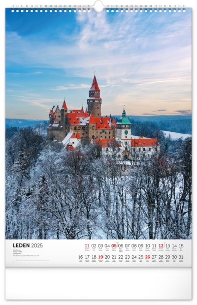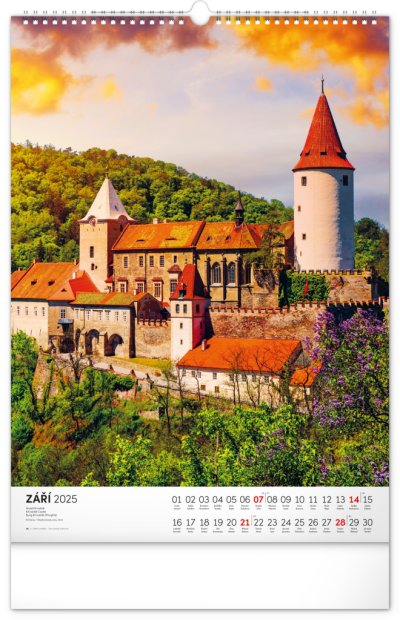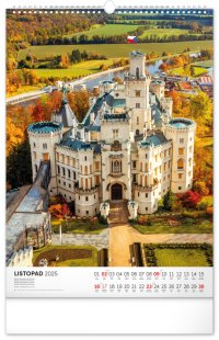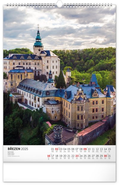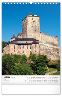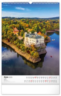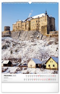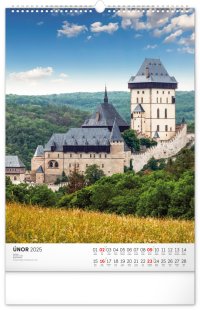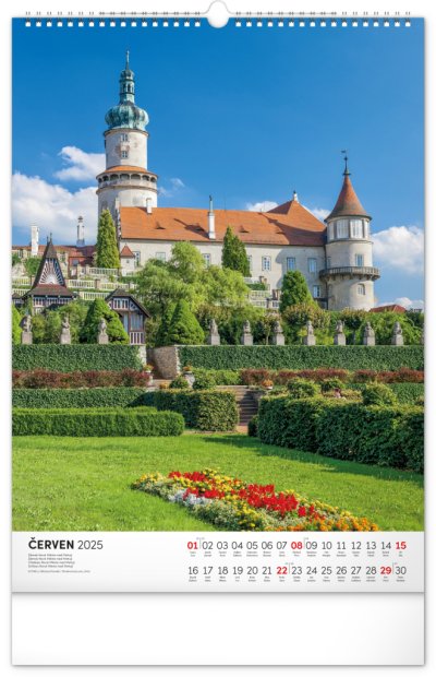 Barevné fotografie Lokte, Lednice, Hluboké či Bouzova na stránkách nástěnného kalendáře ve výškovém formátu. Jednoduché kalendárium s českými svátky a jmény.