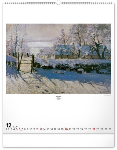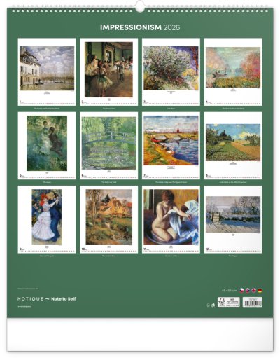 Edgar Degas, Paul Cézanne, Auguste Renoir a další světoznámí impresioničtí malíři jsou zastoupeni v tomto velkoformátovém kalendáři s reprodukcemi jejich obrazů. Kalendář obsahuje jednoduché univerzální kalendárium a popisky k jednotlivým obrazům ve čtyřech jazycích.