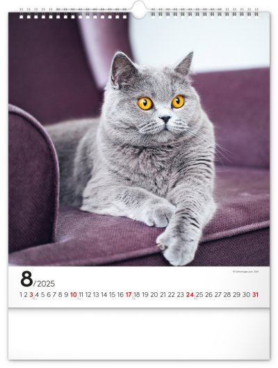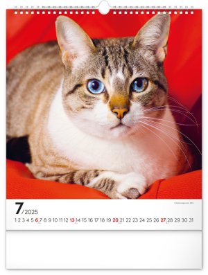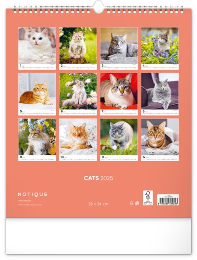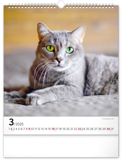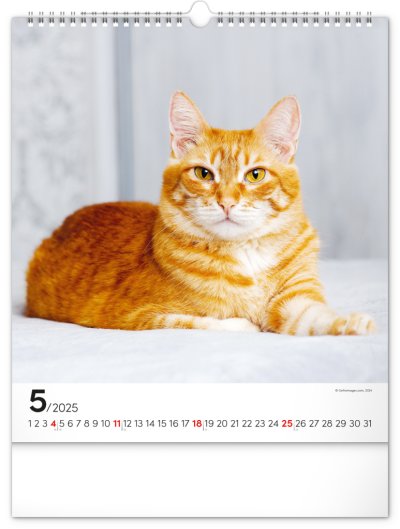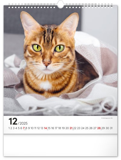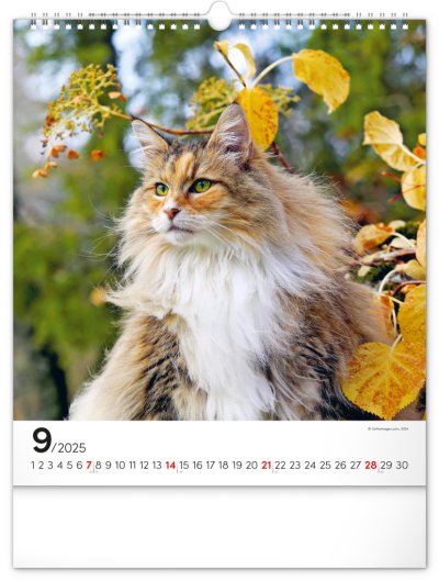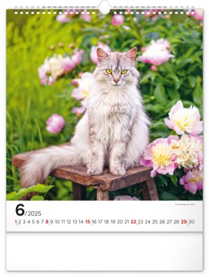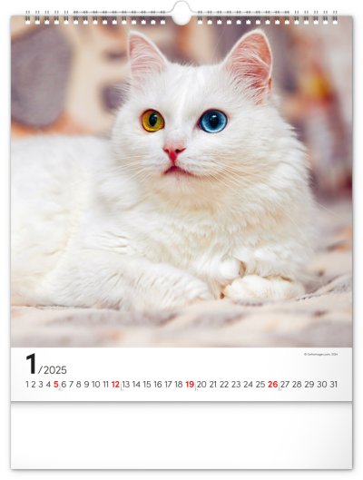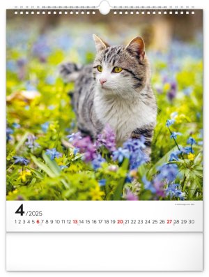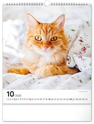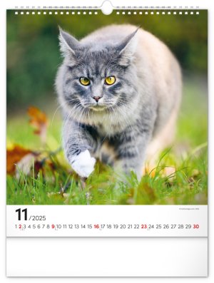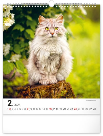 Fotografie osobitých koček na stránkách oblíbeného nástěnného kalendáře s univerzálním kalendáriem na bílém pozadí.