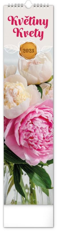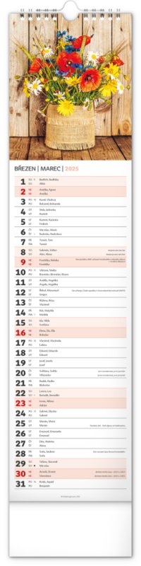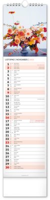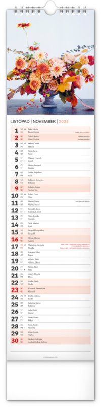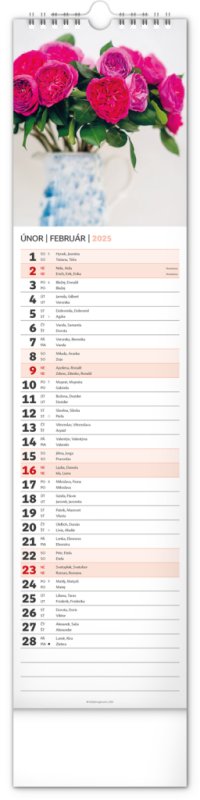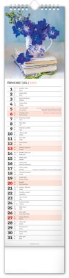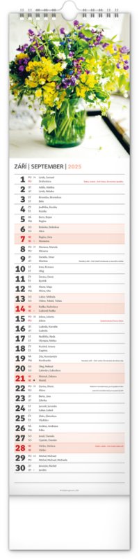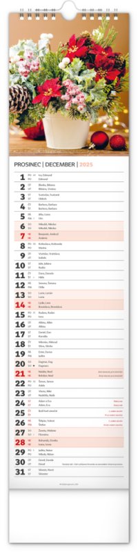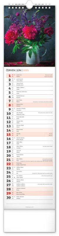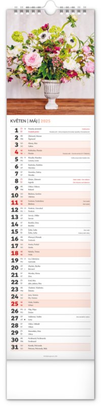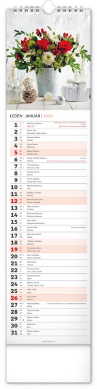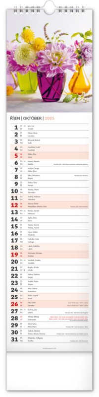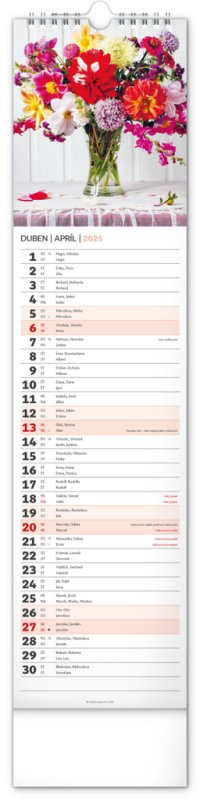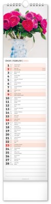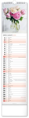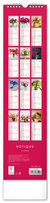Okrasné květiny a květinová aranžmá na stránkách nástěnného kalendáře v praktickém kravatovém formátu, který se vejde opravdu všude. V česko-slovenském kalendáři je rovnocenně zahrnuta čeština a slovenština, česká a slovenská jména, svátky, památné dny i fáze měsíce. V každém dni je prostor pro poznámky.