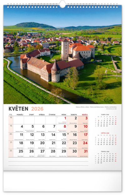 Kalendář s fotografiemi z nejkrásnějších míst České republiky. Praha, Kutná Hora, Olomouc a další skvosty v kalendáři s tématem Má vlast ve výškovém formátu s popisky a jednoduchým kalendáriem.