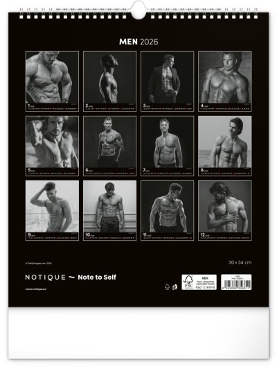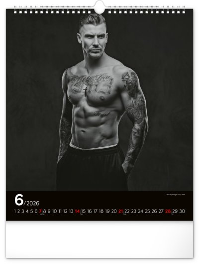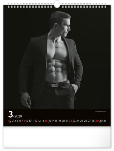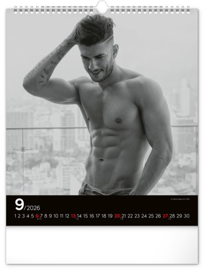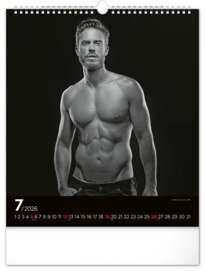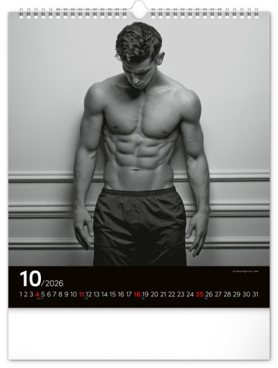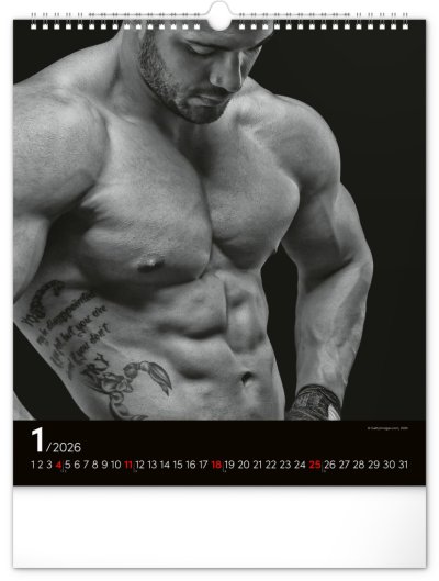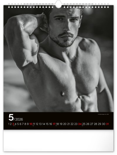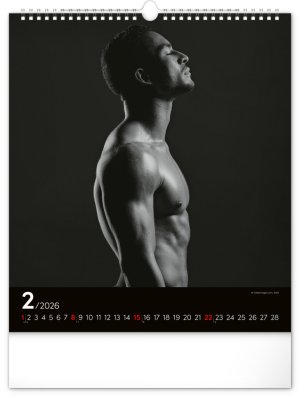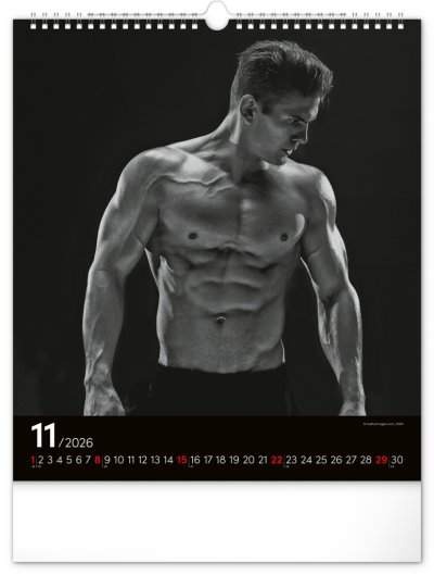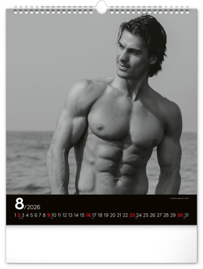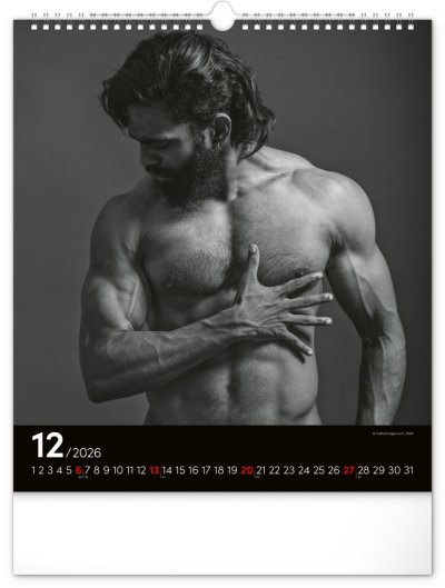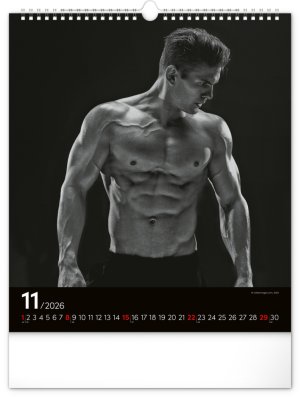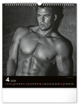 Celý rok se můžete kochat pohledem na vyrýsovaná těla přitažlivých mužů na černobílých fotografiích. Nechybí jednoduché kalendárium na černém pozadí.