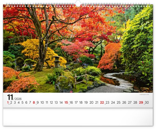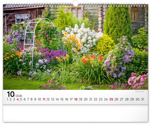 Dvanáct snímků zachycujících pomíjivou krásu květin v zahradách. Vy si však budete pohledu na nádherné barevné zahrady užívat po celý rok. Zahrady, oázy klidu a relaxace v nástěnném kalendáři doplňuje univerzální kalendárium se zvýrazněnými nedělemi na černém pozadí.