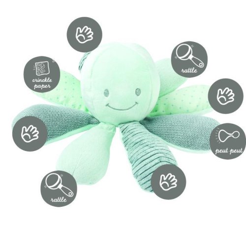 Tato chobotnička se stane prvním skutečným kamarádem Vašeho miminka, která ho uklidní, dodá pocit bezpečí a komfortu. Chobotnička je vhodným kamarádem pro Vaše miminko od jeho narození, a bude ho provázet celým jeho dětstvím, jako věrný společník a kamarád. Chobotnička je vyrobena z jemného a na dotek příjemného materiálu.