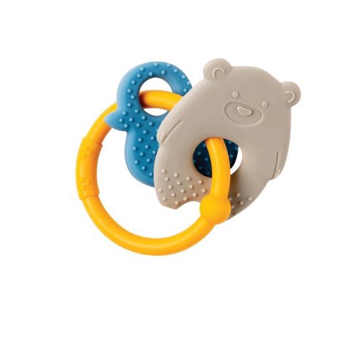 Silikonové kousátko, složené ze tří různých částí, zmírní bolest při prořezávání prvních zoubků. Může být použito i jako jednoduché chrastítko a také díky svému tvaru a designu na rozvoj motorických dovedností malých ručiček. Krásný decentní design. Vhodné od 4 měsíců.