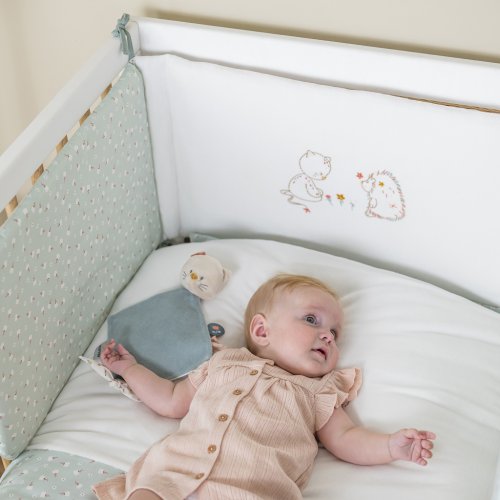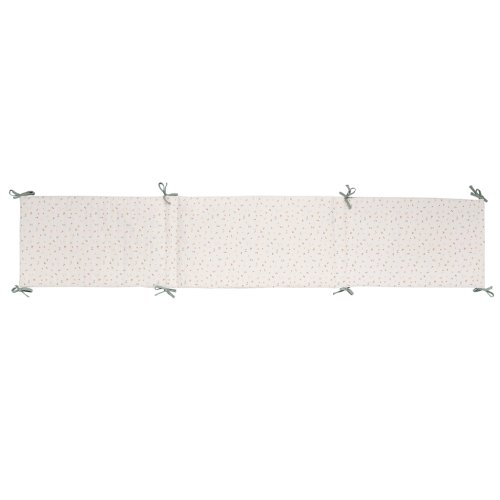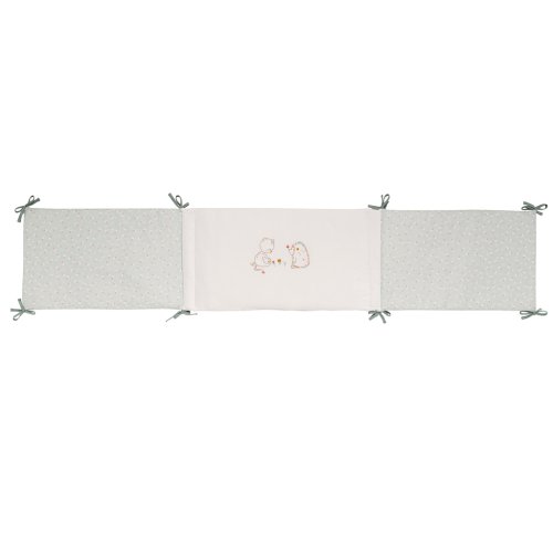 Ochranný mantinel do postieľky s krásnymi aplikáciami zabraňuje nárazom dieťaťa do bokov postele a vytvára útulné a bezpečné prostredie na spanie. Šnúrky pomáhajú jednoduchému priviazaniu k postieľke.