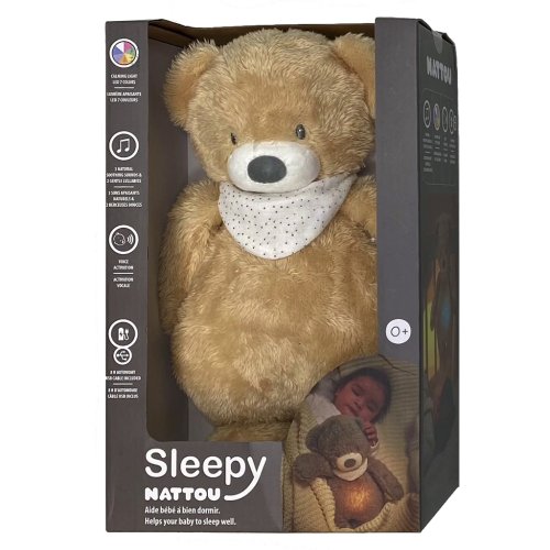 Zajíček na spaní Nattou je krásné měkké kvality s příjemnou výplní. Spící zajíček má v bříšku světýlko, které se může měnit mezi sedmi barvami a zvukem, s bílým šumem, mořem, tlukotem srdce a dvěma uklidňujícími ukolébavkami, které pomáhají zajistit klidný spánek. Zvuky spícího zajíčka se aktivují automaticky, když uslyší pláč dítěte a zvuky automaticky přestanou po 15 minutách. Světlo spícího zajíčka vychází z LED diody v bříšku, takže světlo je tlumeno textilií zajíčka a nepřehřívá se, tedy světlo může bez problémů svítit celou noc.