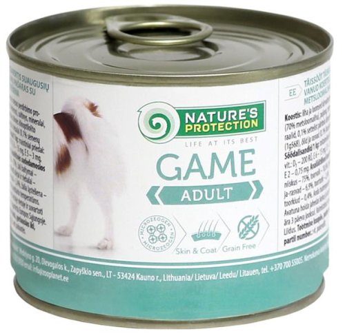 Kompletní krmivo pro dospělé psy se zvěřinou. Složení: Zvěřina 70 %, vývar, minerální látky, klinoptilolit sedimentárního původu (1g568) 0,1%, lněný olej 0,1%. Doplňkové látky: Nutriční doplňkové látky/1kg: vitamín D3 (E671) 200 m.j., E6 (Zn) 15 mg, E5 (Mn) 3 mg, E2 (I) 0,75 mg. Analytické složky: Vlhkost 75 %, protein 10,6 %, hrubé oleje a tuky 6,9 %, hrubý popel 2,4 %, hrubá vláknina 0,4 %. Dávkování: