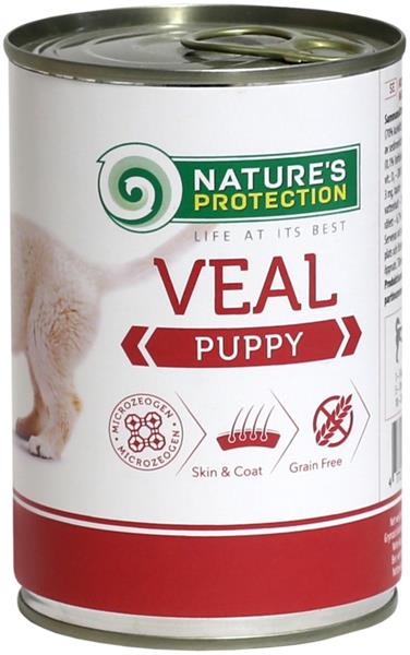 Kompletní krmivo s telecím pro štěňata. Složení: Telecí 70%, vývar, minerální látky, klinoptilolit sedimentárního původu (1g568) 0,1%, lněný olej 0,1%. Doplňkové látky: Nutriční doplňkové látky/1kg: vitamín D3 (E671) 200 m.j., E6 (Zn) 15 mg, E5 (Mn) 3 mg, biotin (3a880) 300 µg, taurin (3a370) 1500 mg. Analytické složky: Vlhkost 75 %, protein 10,6 %, hrubé oleje a tuky 6,7 %, hrubý popel 2,4 %, hrubá vláknina 0,4 %. Dávkování: