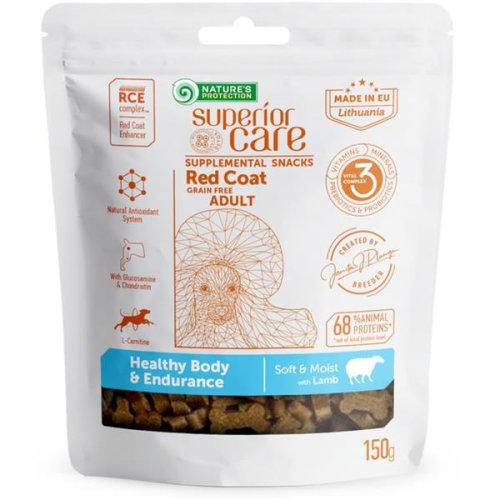 Nature’s Protection Superior Care Red Coat Adult Healthy Body & Endurance je prémiový doplněk stravy s jehněčím masem vyvinutý speciálně pro dospělé psy všech plemen s červenou (rezavou) srstí včetně jedinců s citlivým trávicím systémem. Díky přidané kloubní výživě pamlsky pomáhají udržovat správnou funkci kloubů. Jsou grain-free – neobsahují obiloviny, které by mohly způsobit alergické reakce. Mají vyvážené množství probiotik a prebiotik, díky čemuž přispívají k harmonizaci střevního prostředí, podporují zdravé střevní bakterie a napomáhají hladkému trávení. Speciální složení pomáhá chránit a zvýrazňovat červený pigment srsti. Obsahují: